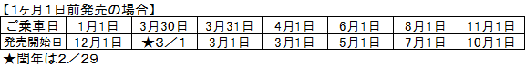 ※ご乗車日の1ヶ月1日前は、ご乗車日の前日の1ヶ月前となります。